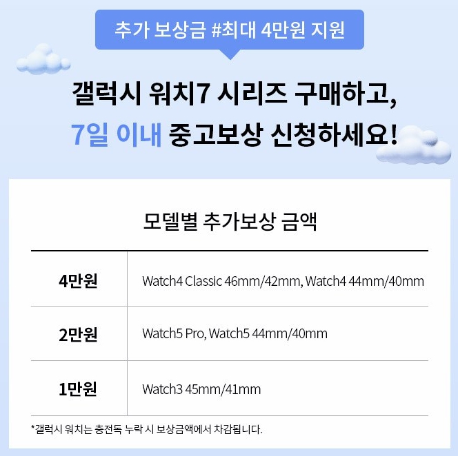 쿠팡에서 구매했을 때는 갤럭시 워치7 보상판매 시세가 최대 4만 원이고 여기에 추가 보상금 4만 원을 더해도 최대 8만 원을 지급받을 수 있습니다.