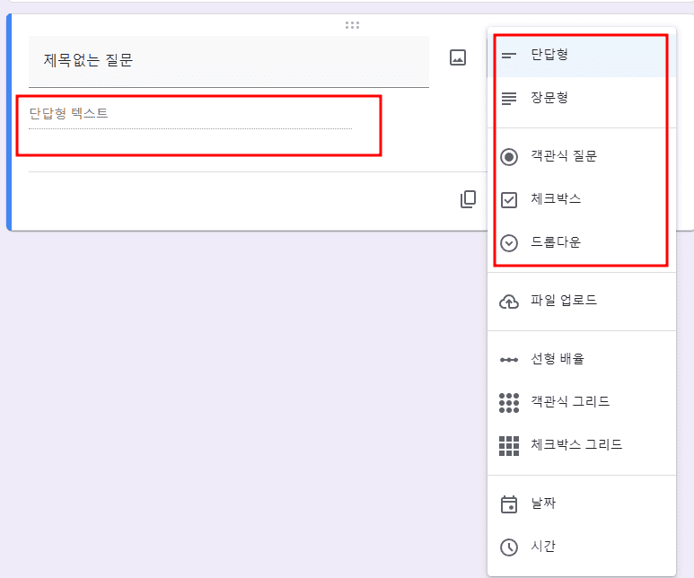여기서 빨간색 박스 부분들을 수정해서 질문을 만들 수 있습니다. 질문을 작성할 수 있고 답변 양식을 정할 수도 있습니다.