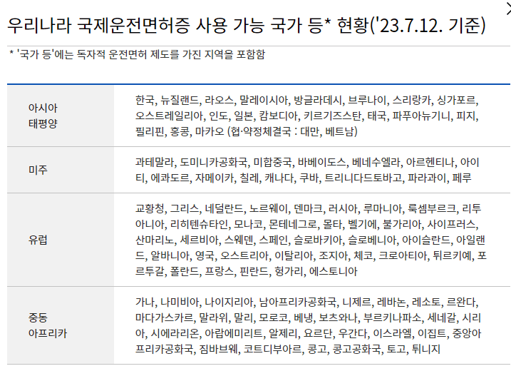 이와 더불어 우리나라와 협약되어 국제운전면허증 사용 가능한 국가들도 이미지로 함께 확인하실 수 있도록 첨부했는데요.