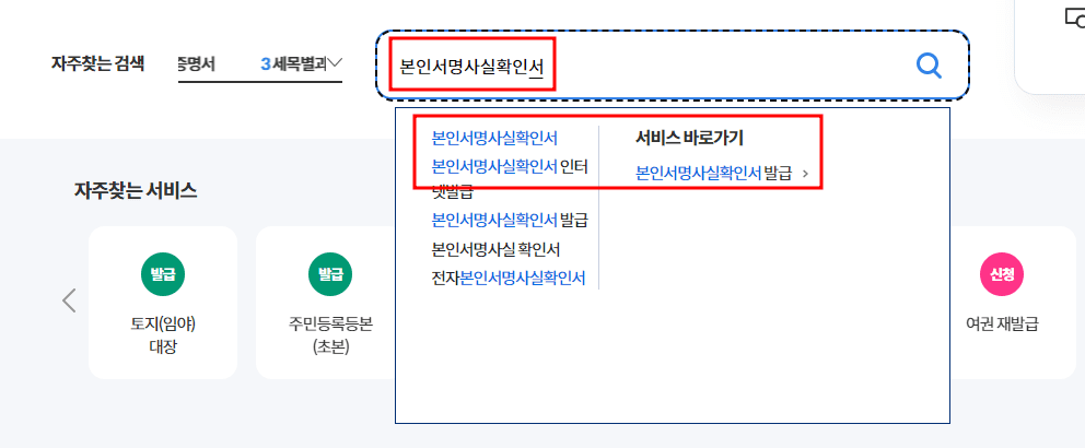 - 로그인 후, 메인 페이지 검색창에 "본인서명사실확인서 인터넷발급" 검색