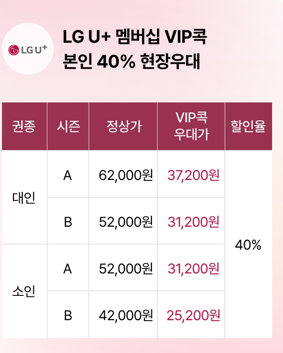 - LG U+ 멤버십 VIP 40% 현장 우대