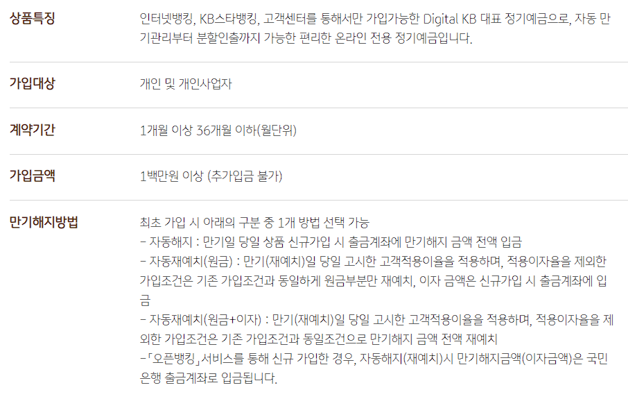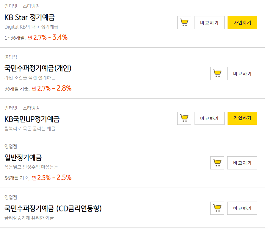 8월 기준 국민은행에서 가입할 수 있는 정기예금 종류는 총 5가지입니다. 이 5가지 중 현재 최대 높은 정기예금 금리는 'KB Star 정기예금' 상품입니다.