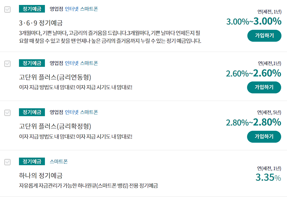 하나은행의 정기예금 상품은 총 9개이지만 그중에 일반적으로 가입할 수 있는 상품은 4가지가 있습니다.