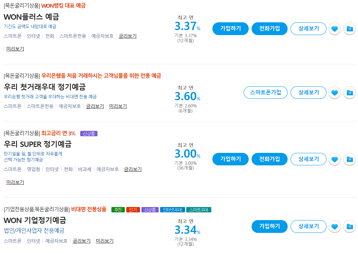 가장 높은 금리 상품인 '우리 첫 거래우대 정기예금' 상품은 최소 6개월부터 들 수 있고 'won플러스 예금'은 최소 12개월부터 가입할 수 있습니다.