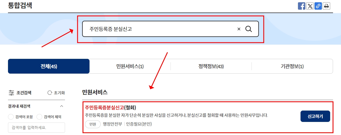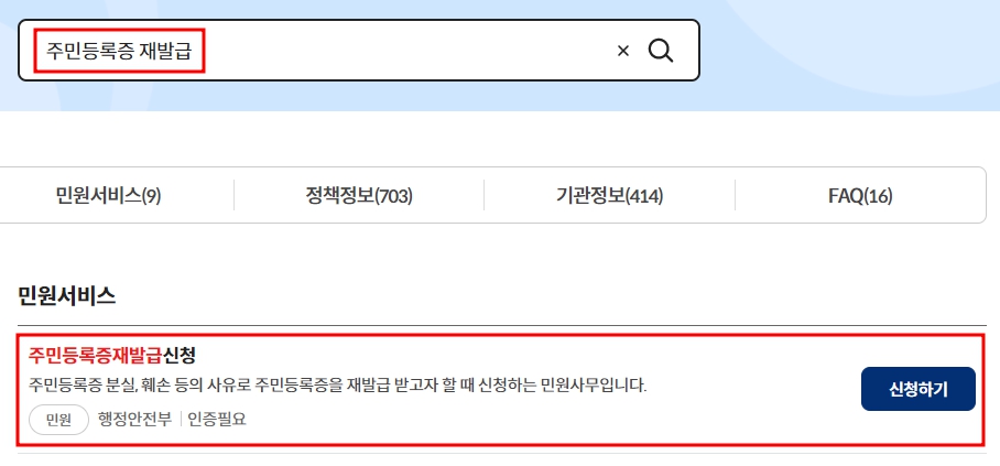 - 검색창에 "주민등록증 재발급" 검색해 주세요.