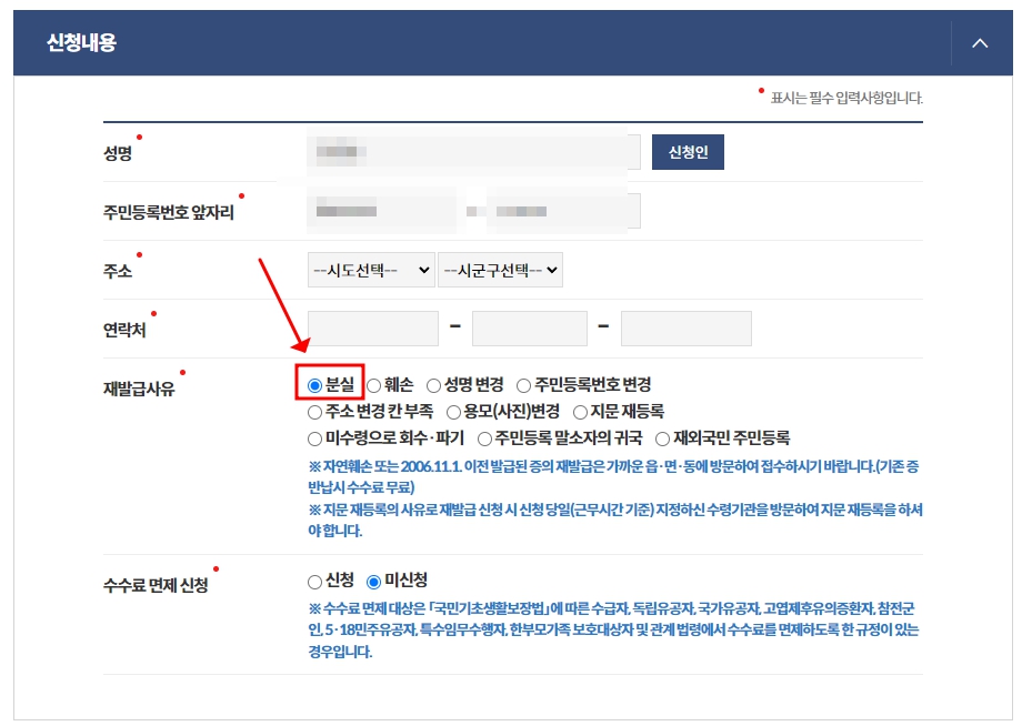 주민등록증 재발급 신청 역시 성명, 주소 등 기본 정보를 모두 기입하고 재발급 사유를 선택하면 됩니다.