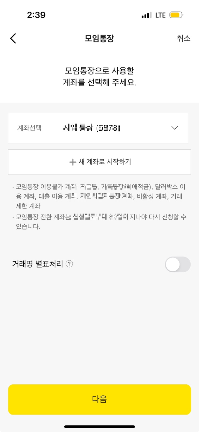 아래 이미지처럼 모임통장 신청하기 버튼을 누르고 기존 계좌를 모임통장 계좌로 전환하려면 "계좌 선택"에서 기존 계좌들 중 하나를 선택해서 모임통장으로 전환하면 되고
