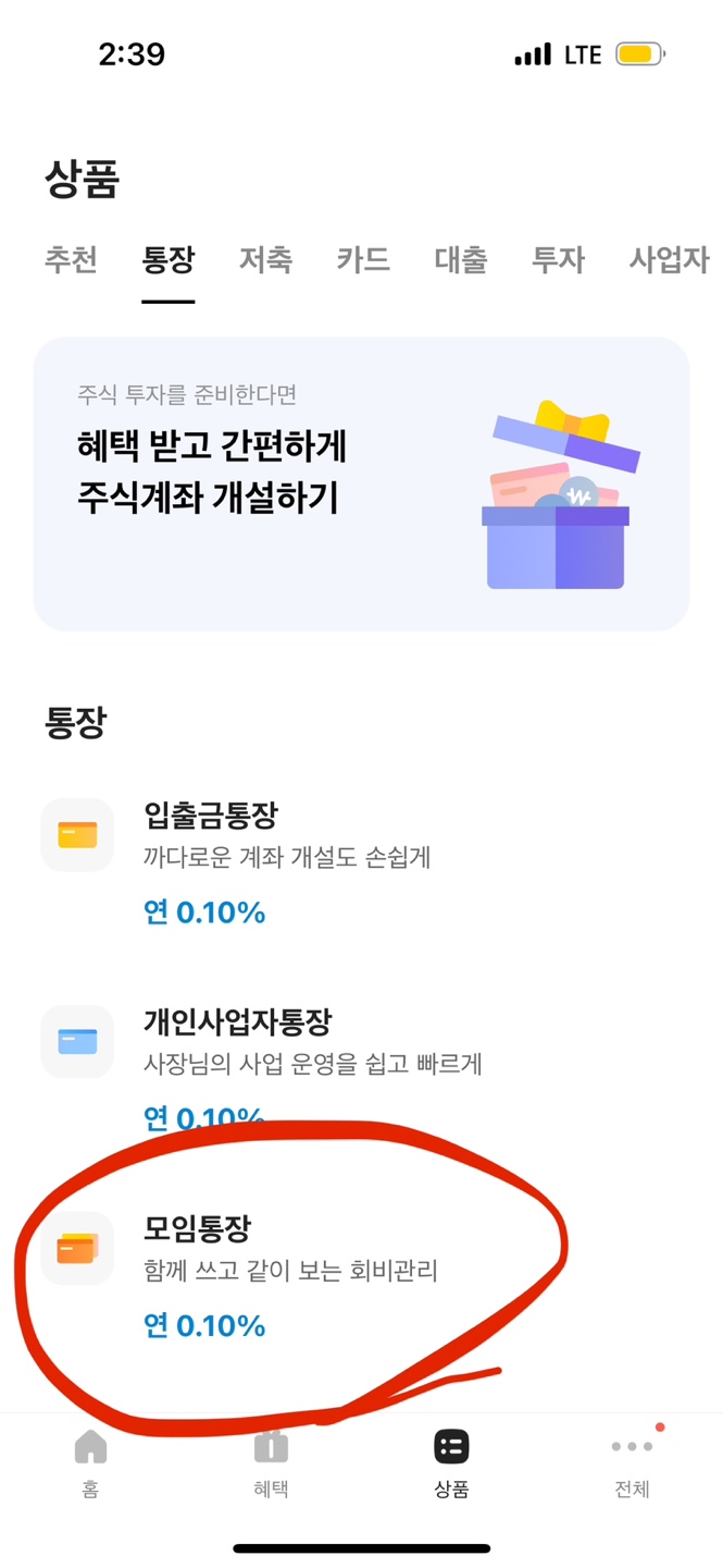 그렇게 상품으로 들어갔으면 위의 우측 이미지에 보이는 것처럼 "모임통장"을 선택해 주세요.