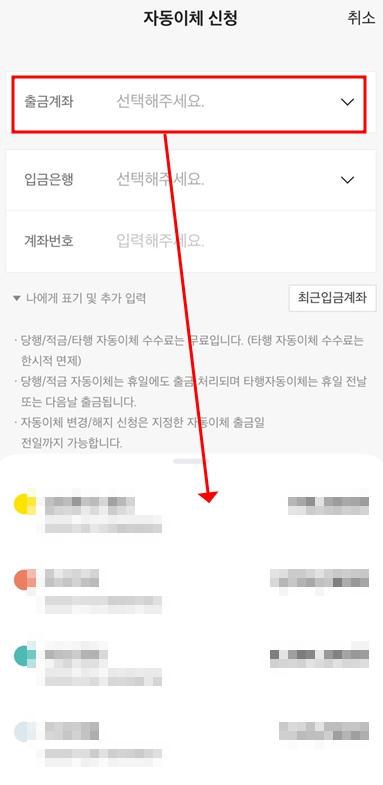 - "자동이체" 탭을 누르면 출금계좌 선택을 해야 합니다.(어디서 돈을 출금해서 모임통장으로 보낼 건지!)