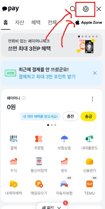 이렇게 이동한 카카오페이 화면에서 우측 상단에 '톱니바퀴' 모양을 클릭해 주세요!