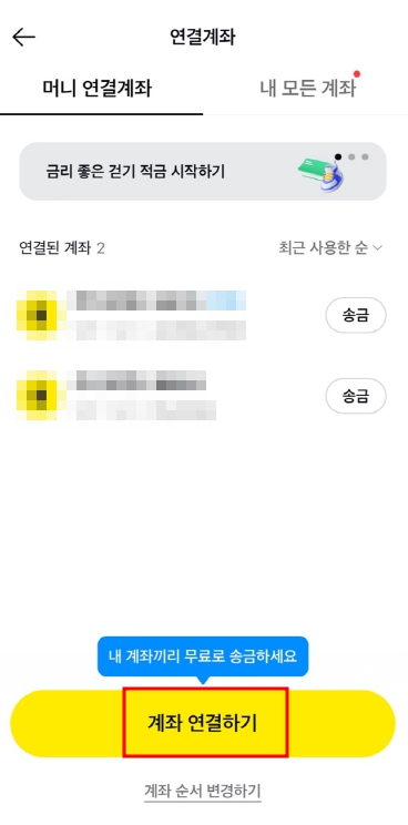 연결계좌 탭으로 들어가서 계좌 연결하기를 눌러 출금 및 입금 계좌를 연결해 주면 됩니다.